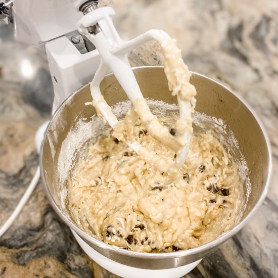 - In a large bowl, sift the dry ingredients together. With a hand mixer cream the butter and beat in the eggs and bananas. Stir this mixture into the dry ingredients; stir just enough to combine (it’s okay if there are lumps). Gently stir in the vanilla, walnuts, coconut and chocolate chips.