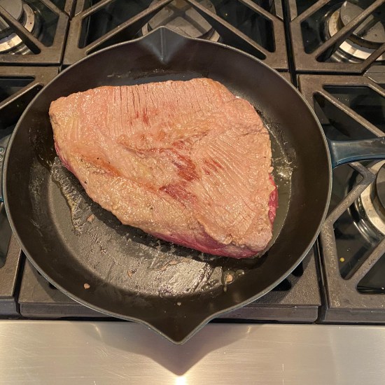 2. Heat a large skillet over a medium flame on the stovetop. Drizzle 2 tablespoons of olive oil into the pan. Brown the brisket on both sides, 4-5 minutes.