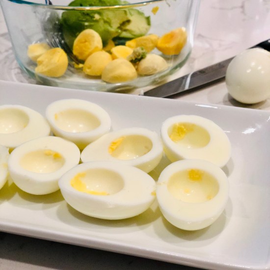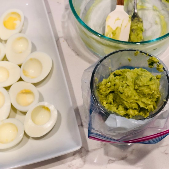 - Once hardboiled, cut eggs lengthwise in half. Remove yolks, reserving whites, and place in a medium bowl. Mash yolks and add in the avocado. Continue to mash with a fork until smooth (if your avocado isn’t ripe enough, there won’t me enough moisture. You can always mix in 1-2 tablespoons olive oil to help it along). Stir in 2 teaspoons cilantro, and season with salt and pepper.