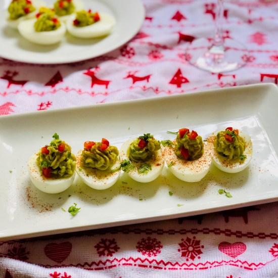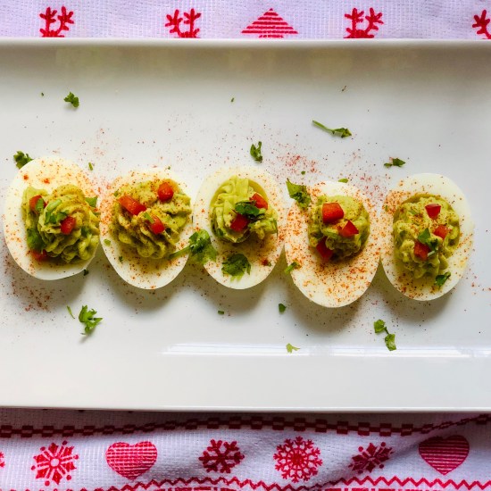 Deviled eggs are some of my favorite appetizers. But, do you ever want to eat one, but decide not to indulge because of all the mayonnaise? Health buffs rejoice! Here is an amazing HEALTHY holiday appetizer – just eggs, avocado, and some toppings. It’s festive and delicious all rolled up into one.