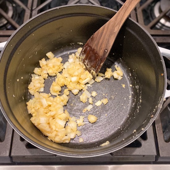 - Melt 1/4 cup of butter in a medium-sized pot over medium heat. Whisk in the flour and cook for a couple of minutes until light golden. Add in the onion and cook until transparent (about 2-3 minutes), then add the garlic and cook until fragrant (about 30 seconds).