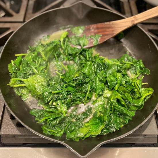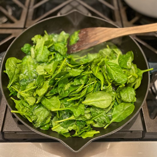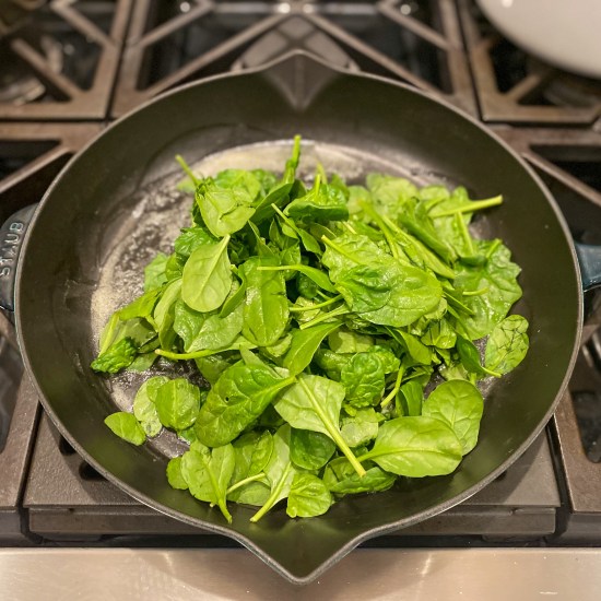 - In a separate pan, melt the remaining butter, and add spinach in batches, wilting each batch before adding the next, until all spinach is wilted. (add a small spoon of water if the pan gets too dry.)