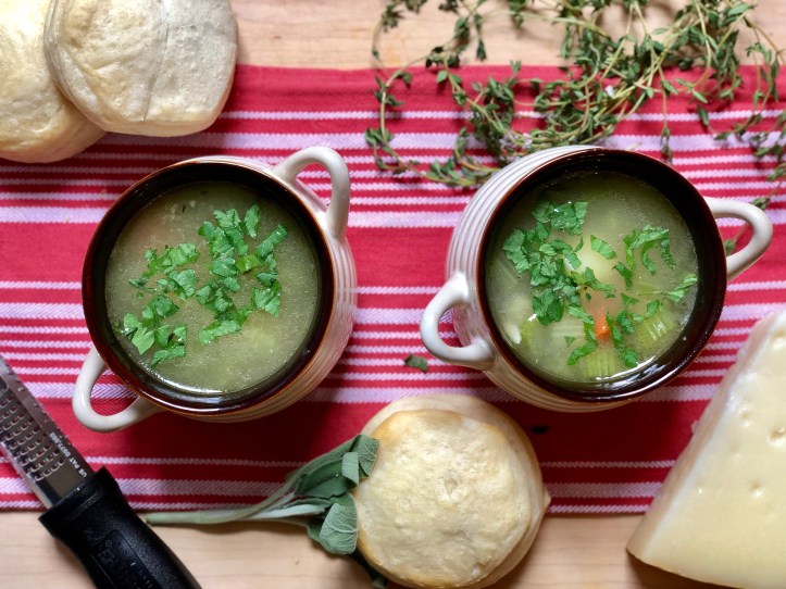 When I was thinking of a recipe to make with the turkey stock I made from yesterday’s Christmas turkey, I thought making my go-to chicken/turkey noodle soup would be easy and straight forward. But, the creative juices were flowing, so I decided to make dumplings instead of using noodles. And boy, was I right. This is a GOOD ONE!