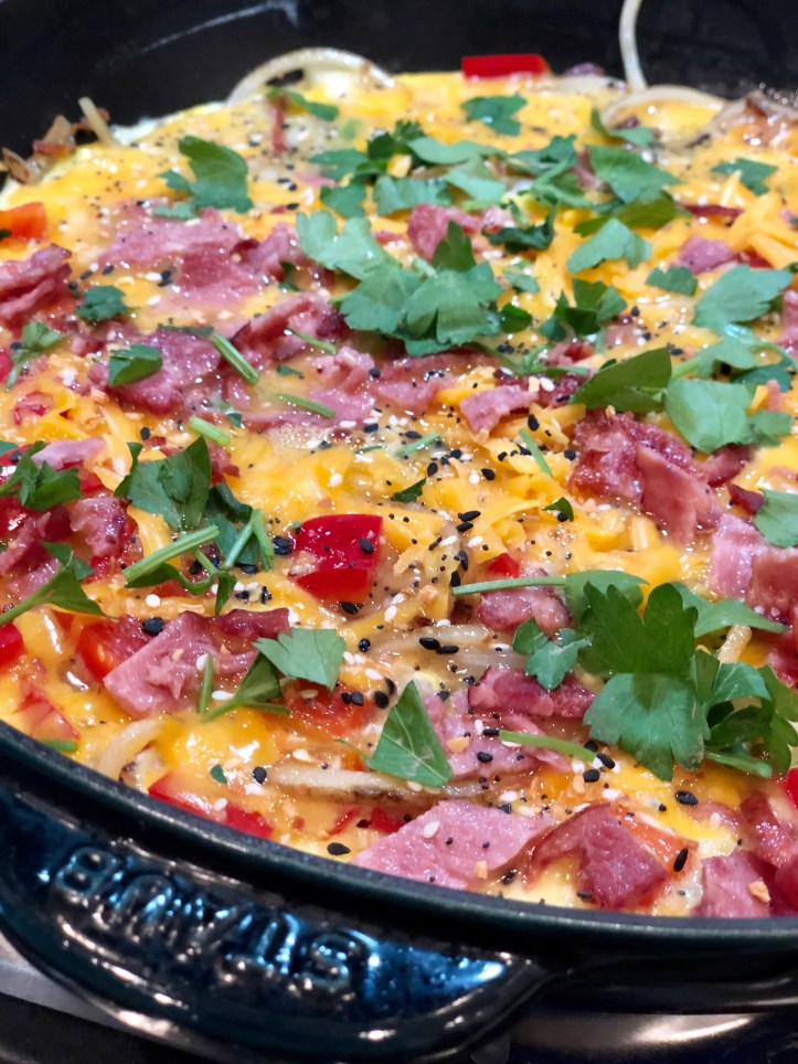 Her original recipe took all my favorite elements of a baked potato and made them breakfast friendly. I had some extra veggies and herbs laying around, so I threw them in to my frittata and had the perfect post Christmas, pre New Year’s breakfast for my whole family!