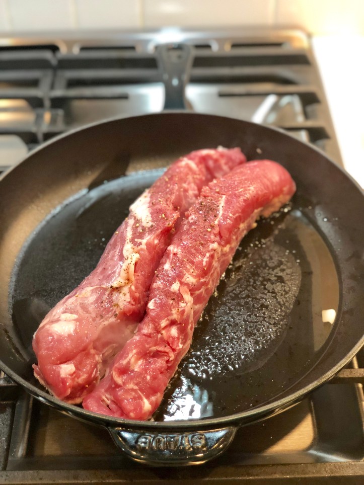 - Pat the pork loin dry with paper towel, and season with 1 teaspoon salt and 1 teaspoon pepper. Add 1 tablespoon of olive oil to the cast iron skillet, and sear the pork loin until golden brown, about 1-2 minutes. Flip and sear all sides. Transfer the pork loin to a plate (it will finish cooking in the oven).