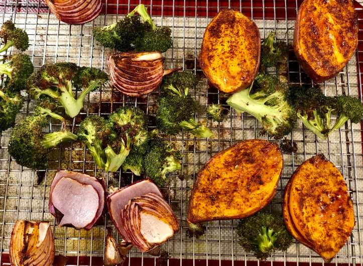 - While the sweet potatoes cook, chop the broccoli into florets (about 5 cups total). Remove the baking sheet from the oven and flip the sweet potatoes so that they are cut sides down. Push the sweet potatoes and onions to one side and add the broccoli to the open side of the pan. Drizzle with 2 teaspoons olive oil and remaining 1 teaspoon chili powder. Carefully toss to coat, and then return the baking sheet to the oven. Return to the oven and bake for an additional 20 to 25 minutes, until the sweet potatoes are soft and the other vegetables are crisp-tender.