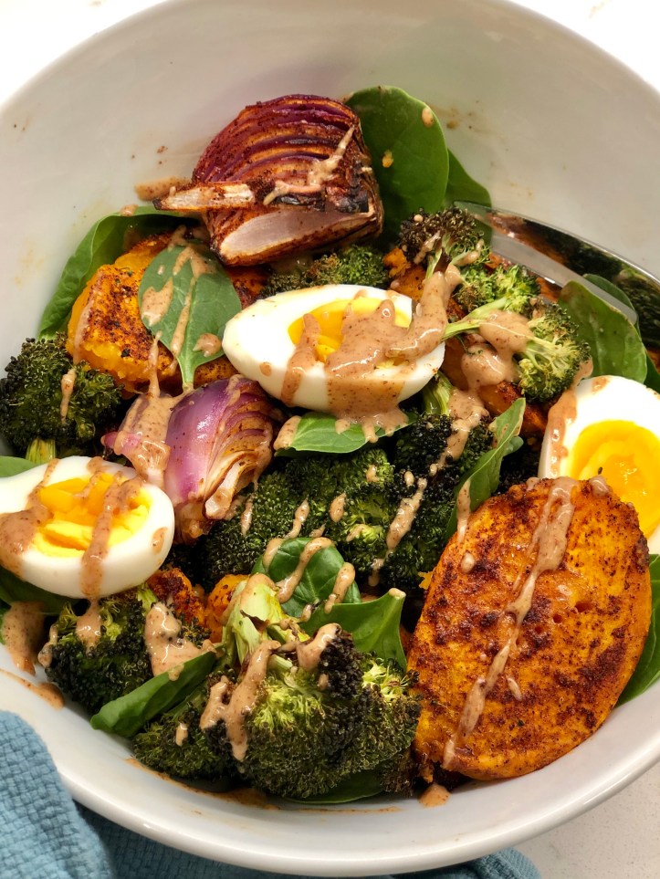 - To serve, once the vegetables are cool enough to handle, cut the sweet potatoes into bite-size pieces. Roughly chop the spinach. Divide the vegetables among serving bowls. Slice the hardboiled eggs in half and place 2 halves on top of each bowl. Drizzle with dressing and enjoy immediately. Enjoy!