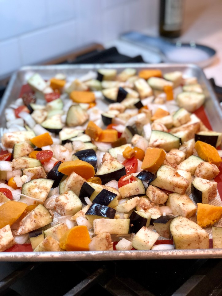 - Whisk together 3 tablespoons of the oil, juice of half a lemon, garlic, 2 teaspoons salt, coriander, cinnamon, cumin and ginger in a large bowl. Add the onions, eggplant, sweet potatoes and tomatoes and toss well to fully coat the vegetables. Divide among the prepared baking sheets and arrange in a single layer. Roast until the sweet potatoes and eggplant are lightly browned and fully softened, 50 to 55 minutes, rotating trays and switching from top to bottom halfway through.