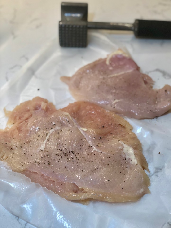Place the chicken breasts between two pieces of parchment paper and pound them down to make them even in thickness. Sprinkle each side of the chicken with salt and pepper.