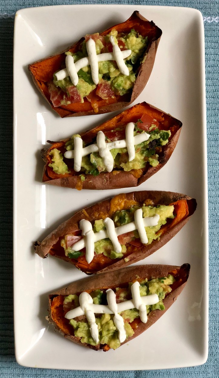 - Fill each sweet potato skin with guacamole, tomato, onion and cilantro. Using the sour cream, draw football laces across the sweet potato and enjoy immediately during the game!