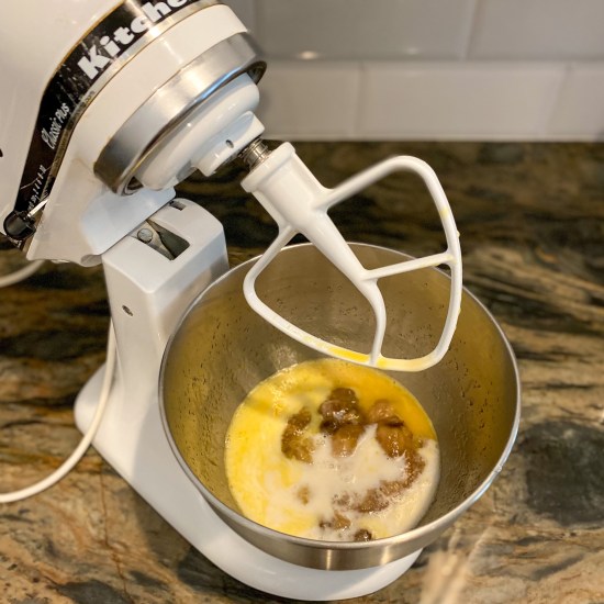- In a large bowl, beat the oil and honey together with a whisk until combined. Add the eggs and beat well. Whisk in the mashed bananas and milk. Add the baking soda, vanilla, salt and pumpkin pie spice, and whisk to blend. Stir in flour just until combined (don’t overmix!).