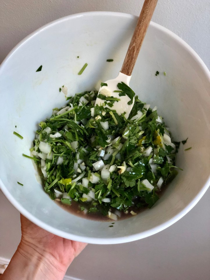 - To make the chimichirri sauce, in a small bowl, combine cilantro, parsley, onion, garlic and red pepper flakes (I kept mine on the chunky side, but you can make this smoother in the food processor if you want). Stir in lemon juice and vinegar. Slowly drizzle in olive oil, stirring constantly until combined. Season with adobo. Cover and refrigerate until ready to use.