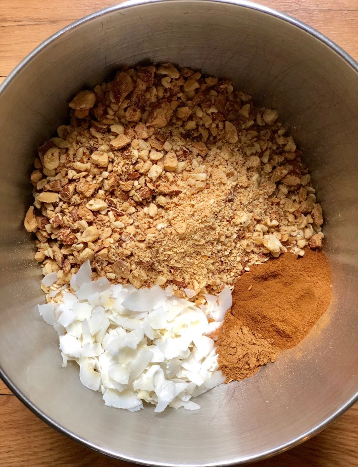 - In a large bowl, combine all dry ingredients (oats, cashews, pecans, sunflower seeds, unsweetened coconut flakes, pumpkin pie spice and cinnamon).