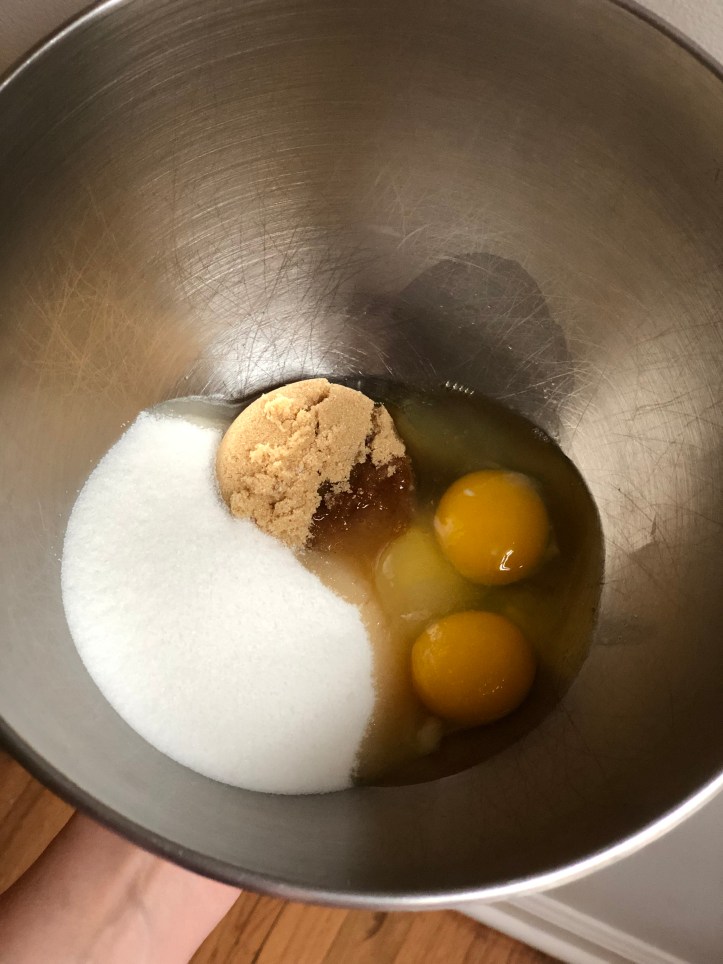 In a large mixing bowl, combine the sugars, eggs, vanilla extract and salt; whisk vigorously for 2-3 mins until creamy and all the sugars are well combined into the mixture.