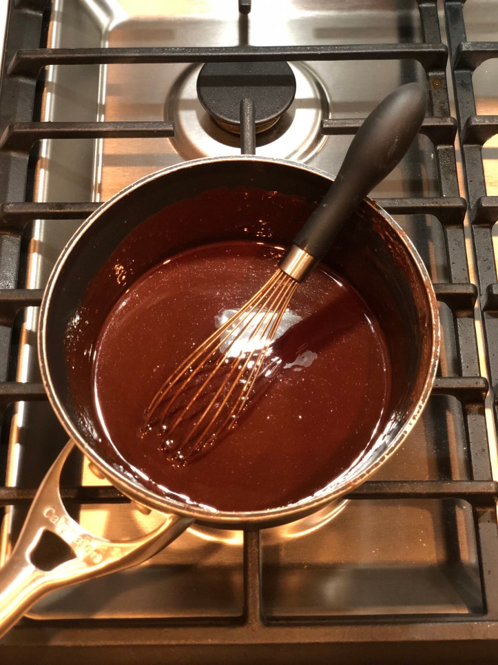 Place the chocolate in a small pot and warm over medium heat until it starts to melt. Melt the butter in the microwave and pour it over the chocolate. Stir until the chocolate melts. Then, set aside to cool.