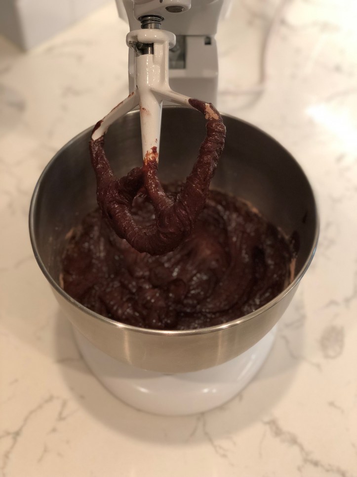 Whisk in the chocolate/butter mixture. Then sift in the flour and cocoa powder (Fold it in just until combined; don’t over mix).