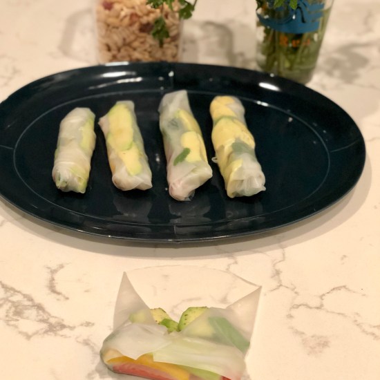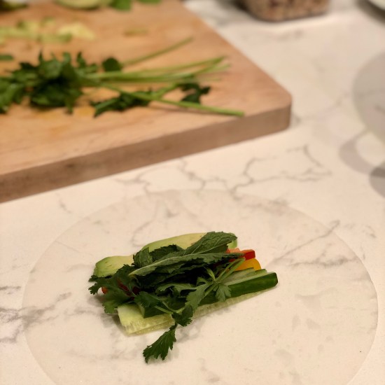 - Fill a shallow dish with warm-hot water (you should be able to stick your hand in the water with it being quite hot). Add each rice paper sheet, one at a time, for 5 to 10 seconds. Remove and place on a flat surface. Towards one end of the rice wrapper, begin layering with 1-2 slices of avocado, and small handfuls of fresh cilantro + mint, and a handful of veggies. Sprinkle the veggies with salt and pepper. Fold both ends to the center and roll the sheet as tightly as you can without ripping.