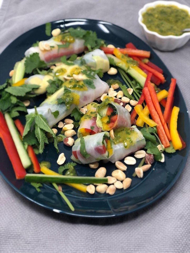 - Serve the spring rolls with the mango dipping sauce and chopped peanuts (if desired). Enjoy!