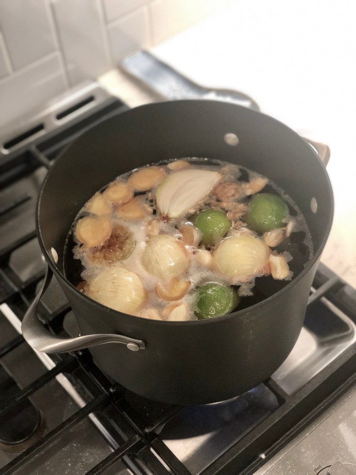 - Combine soy sauce, ginger, sugar, salt, lime juice, lime rinds, garlic, onion, and 1 gallon (16 cups) water in a large stockpot. Bring to a boil, turn off heat and give it a stir.