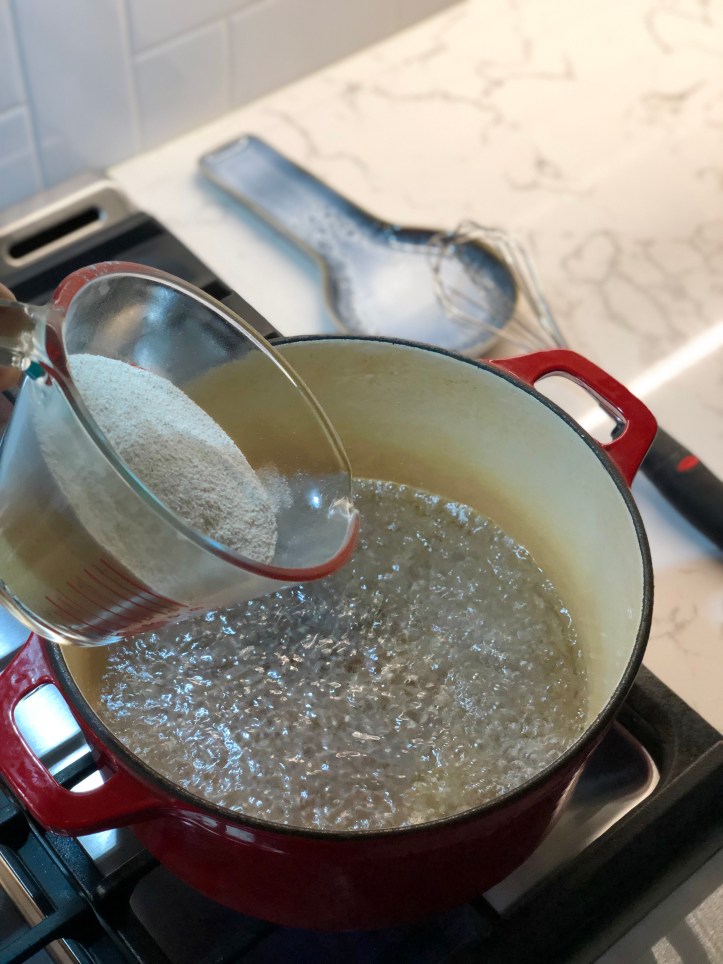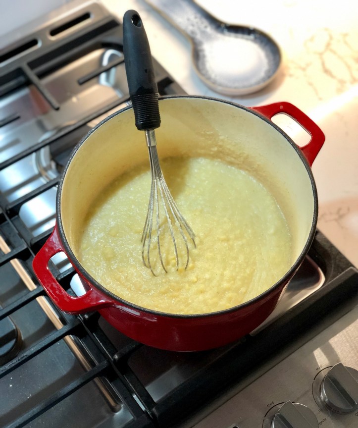 - In a large, heavy bottomed pot, bring 2 cups of water to a boil. Add 1 teaspoon salt and slowly add in the cornmeal. Whisk continuously for 1-2 minutes until polenta begins to thicken.