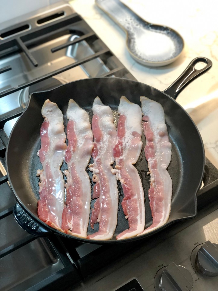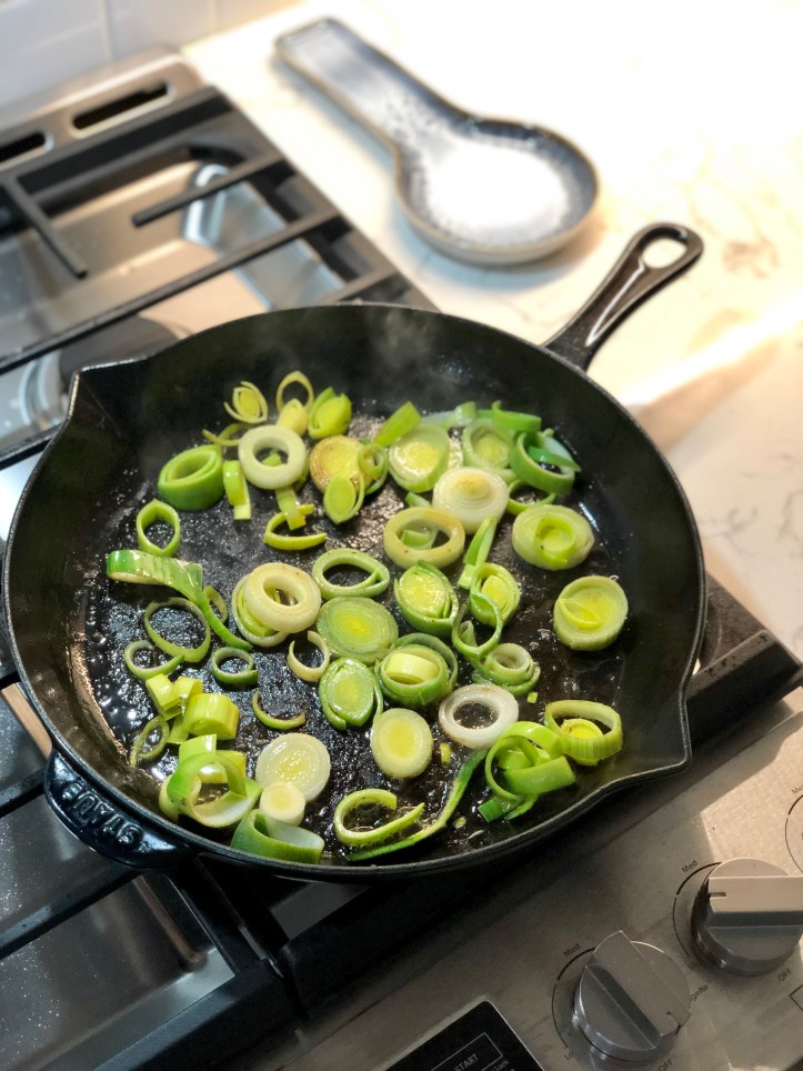 - Cook the thinly sliced leeks in the bacon fat until softened, about 5-8 minutes, then add the bacon back in to warm it up.