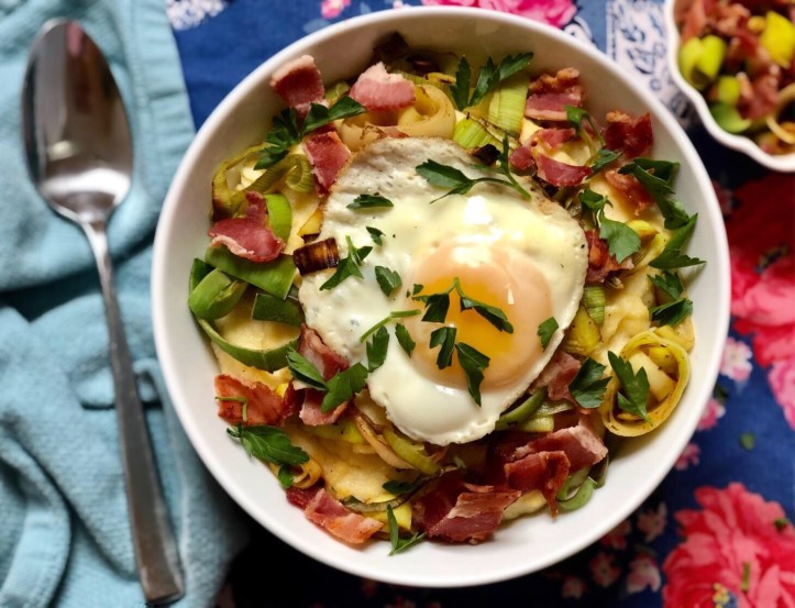 - To serve, place a big spoonful of polenta in a bowl, top with the bacon and leeks, then a fried egg. Season with some freshly ground black pepper and serve. Enjoy!
