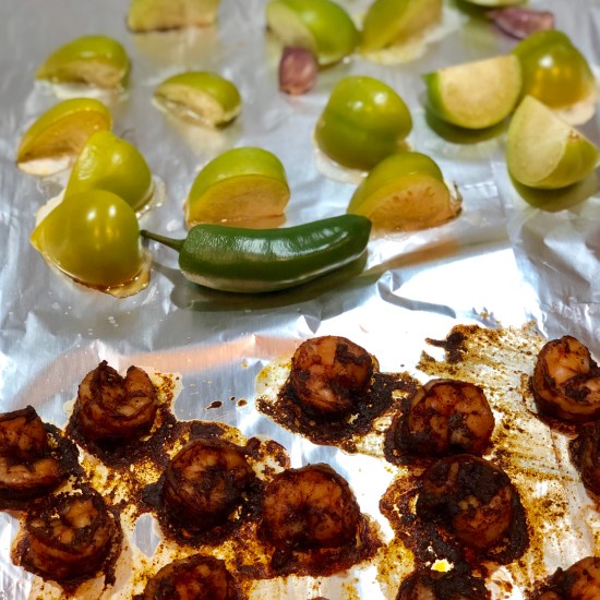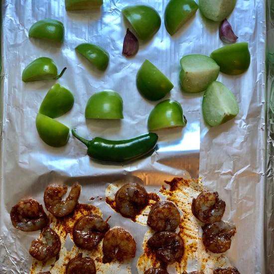 - On a baking sheet, toss together the shrimp, olive oil, chili powder, ginger, thyme, cinnamon, and a pinch each of salt and pepper. Arrange in a single layer on one side of the pan. To the other half of the pan, add the tomatillos, jalapeño, and garlic. Transfer to the oven and roast 10-12 minutes or until the shrimp is cooked and the tomatillos lightly charred.