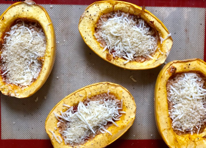 - Spoon the tomato sauce evenly into each spaghetti squash half. Top with mozzarella, bread crumbs and parmesan. Return to the oven and roast another 10-15 minutes, until the cheese is melted.