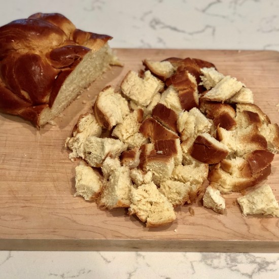 2/3 loaf (about 4 cups) of challah bread, cut into 1-inch cubes