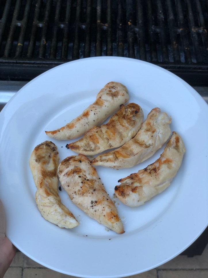 - Coat chicken tenders with 1/4 cup olive oil and season with salt and pepper. Cook for 3-4 minutes per side, or until fully cooked. Transfer to plate to rest.
