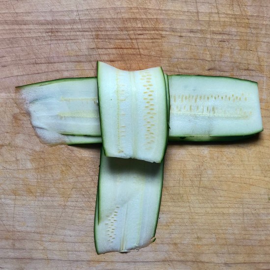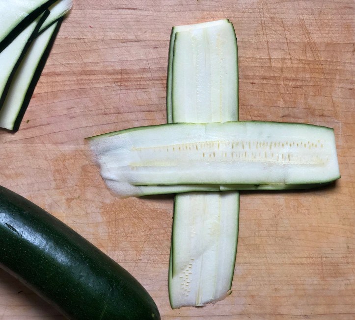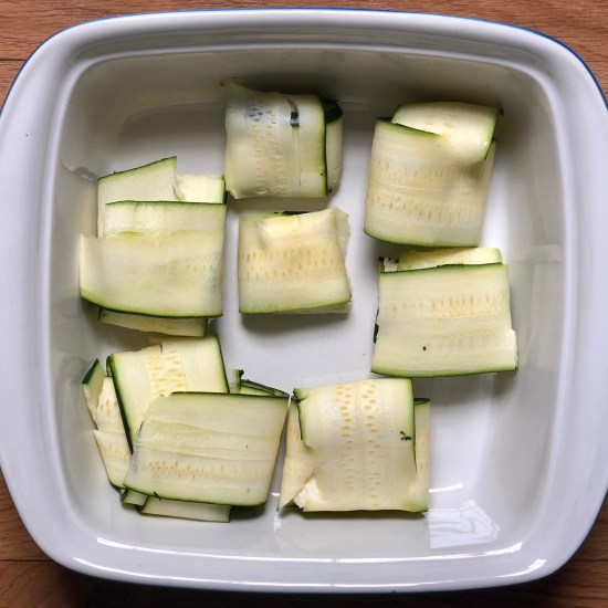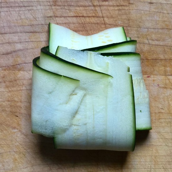 - Make the noodles: Slice two sides of each zucchini lengthwise to create two flat sides. Using a vegetable peeler or mandolin, slice each zucchini into thin flat strips, peeling until you reach the center.