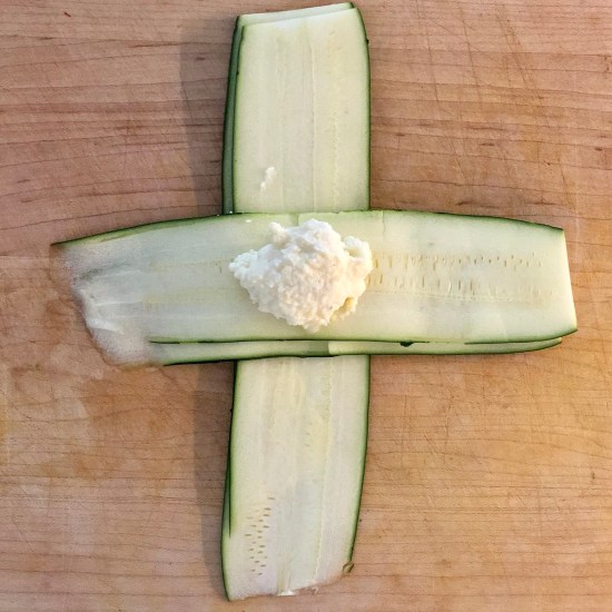 - Assemble the ravioli: Lay two strips of zucchini noodles so that they overlap lengthwise. Lay two more noodles on top, perpendicular to the first strips. You should end up with a “+” shape. Spoon 1 tablespoon of filling in the center of the zucchini. Bring the ends of the strips together to fold over the center, working one side at a time. Turn the ravioli over and place in the baking dish seam-side down. Repeat with remaining zucchini and filling. Pour marinara around the zucchini and top ravioli with mozzarella.Bake until zucchini noodles are “al dente” and the cheese is melted and starting to brown on top; 25 to 30 minutes.
