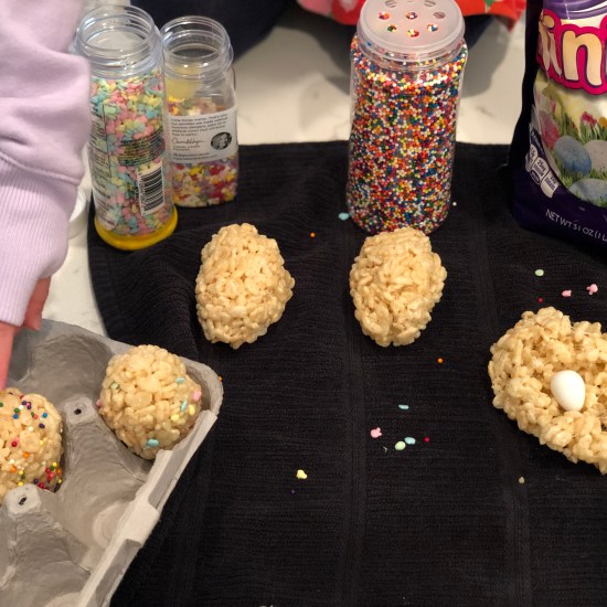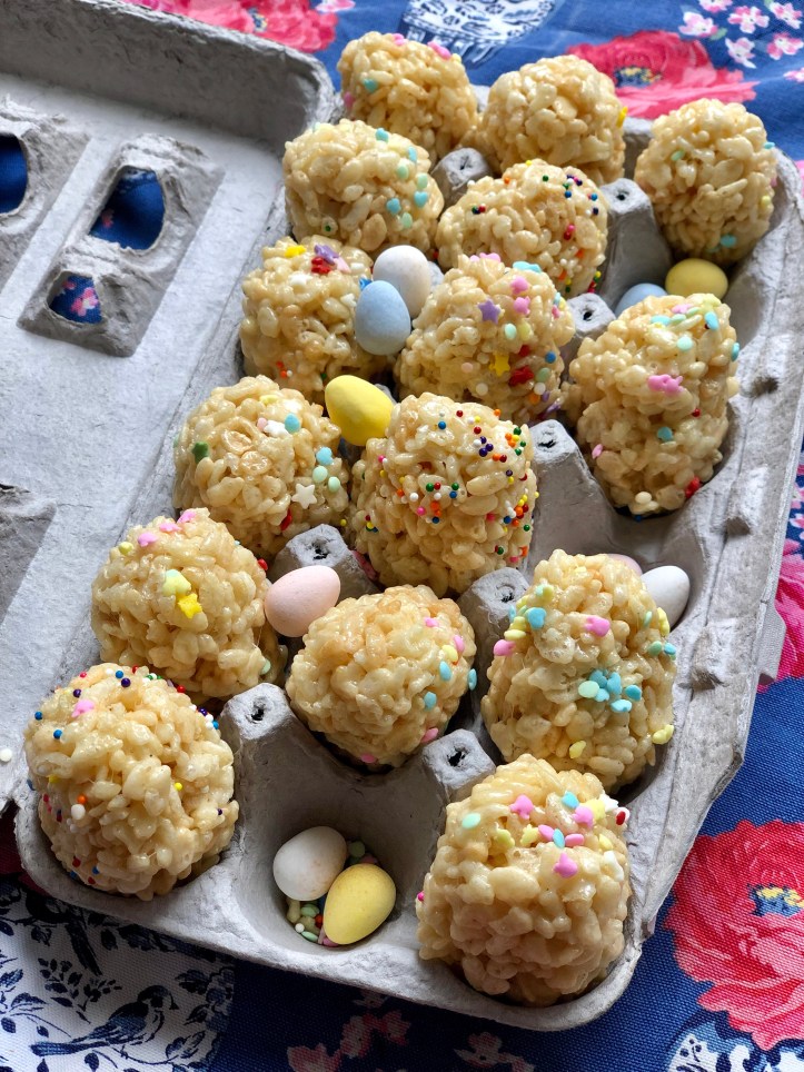 Like many other kids, Rice Krispies treats were a really special treat in my house growing up. You could make them into orange pumpkins for Halloween, red hearts for Valentine’s Day or as stuffed Easter eggs like I made here. They’re super easy to make (that is, once you learn the trick of spraying your hands with cooking spray) and they’re kid favorites!