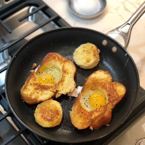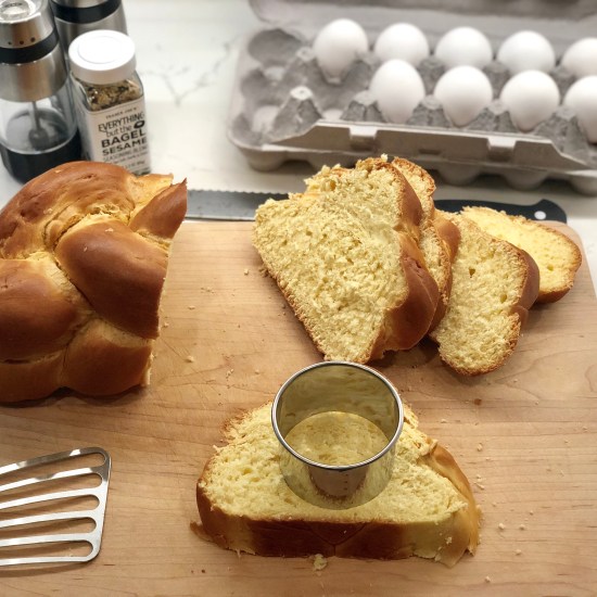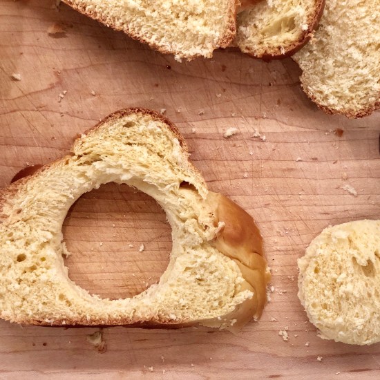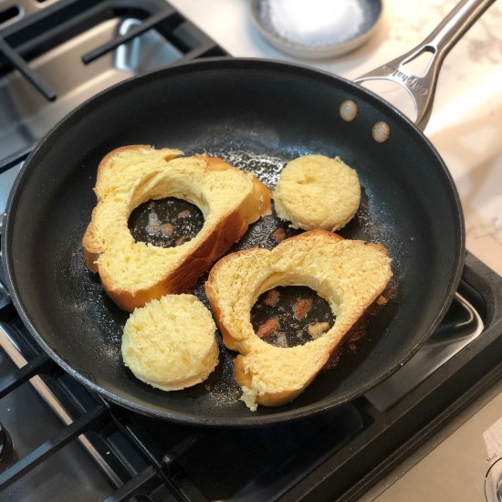 This week, I made a kid-friendly, adult-friendly and deliciously-easy breakfast. It’s called lots of things in lots of places, but I call it challah egg-in-a-hole. You can make egg-in-a-hole with any type of bread. But, fried challah bread with an egg in the middle is absolutely decadent for a weekend brunch. But, it’s easy enough to make during the week.