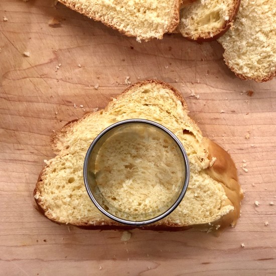 - Use a 2-inch cookie cutter to cut a hole in the middle of bread slice. Reserve the removed portion to toast, if desired.