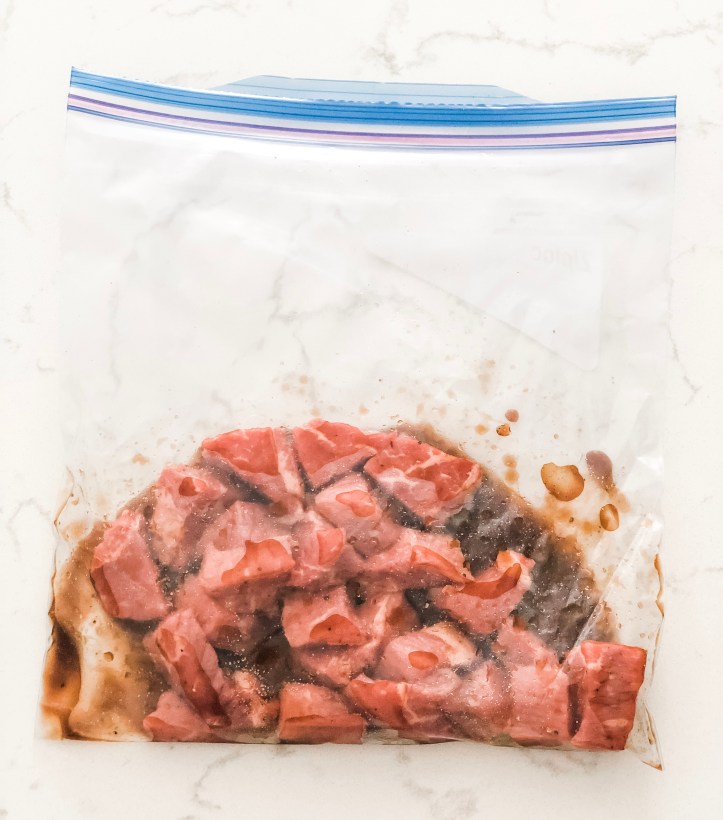 - In a reusable, sealable bag (like Ziploc), mix soy sauce, brown sugar, distilled white vinegar and seasonings. Reserve about 1/2 cup of this marinade for basting. Place steak in bag and seal. Refrigerate for 8 hours, or overnight.