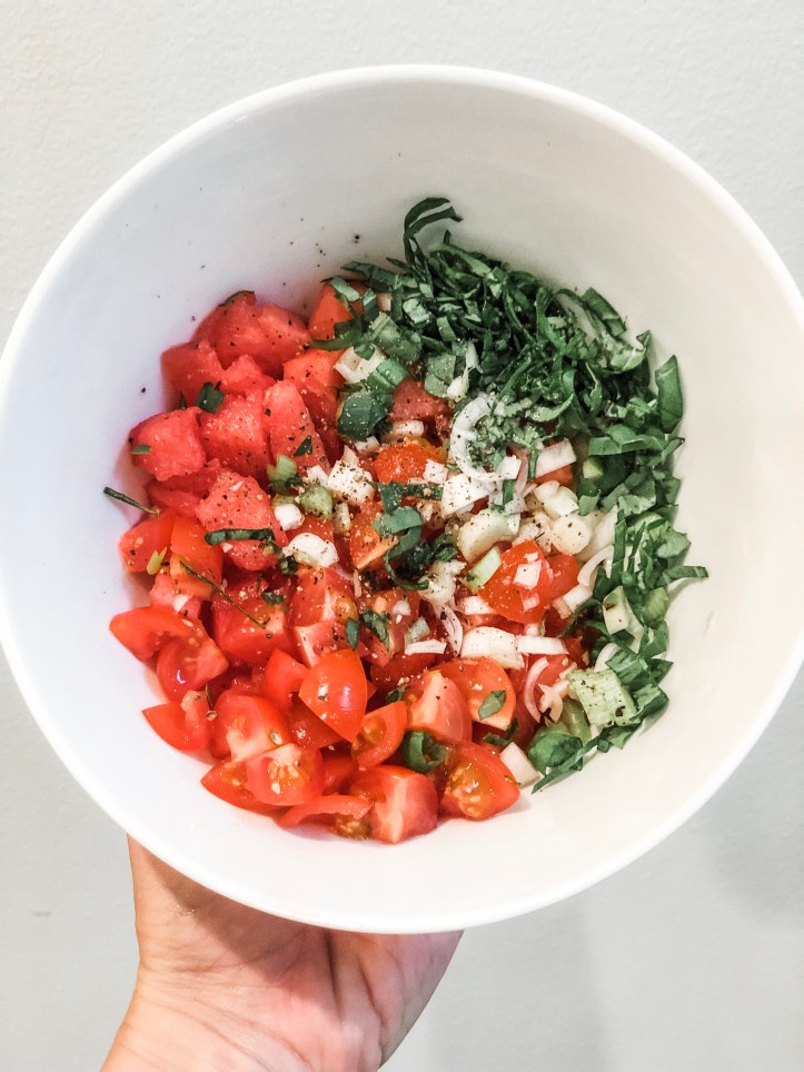 - In a medium bowl, combine watermelon, tomato, green onions, basil, lime juice and pepper. Toss to coat. Set aside.