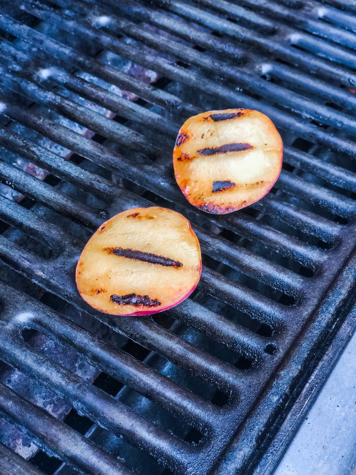 - Cut peach in half and twist off the pit. Brush the cut sides of the peaches with olive oil and grill, cut side down, until the fruit has developed grill marks and started to soften, about 4 to 5 minutes.