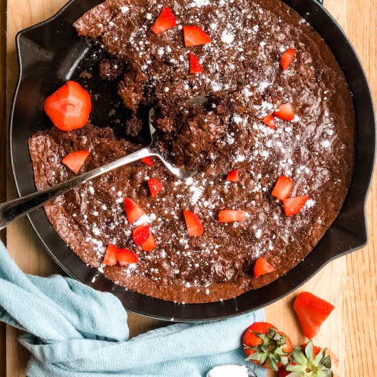 Tonight, we were bbq’ing and I contemplated making brownies on the grill. But, but the time I got my act together, it was raining outside (again!). So, I made skillet brownies in the oven and they are perfect. Soft in the middle, crunch on the edge… truly the perfect brownie.