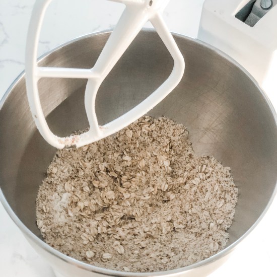 - In a separate bowl, combine oats, almond flour, baking powder and salt. Pour wet banana mixture into dry oat mixture and stir until just combined (don’t over mix).