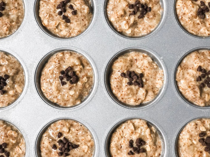 - Spoon batter evenly into 12-muffin tins (each muffin will be nearly full) and top with mini chocolate chips, if desired.