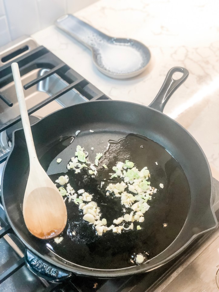 - In a cast iron skillet, heat olive oil until warm and saute scallions and garlic until fragrant, about 2 minutes.