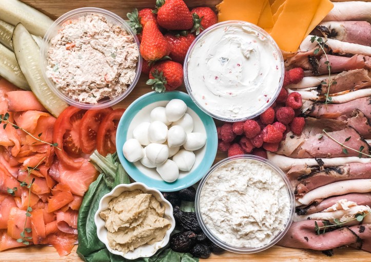 - Variety of deli meats, smoked fish and cheeses (lox, turkey, pastrami, cheddar cheese slices, mozzarella balls, etc…)