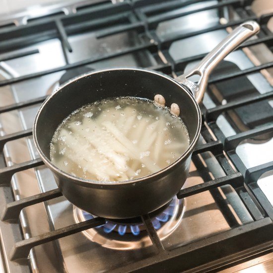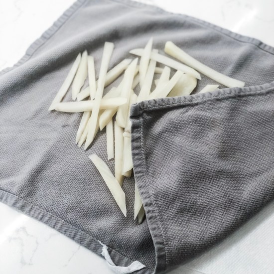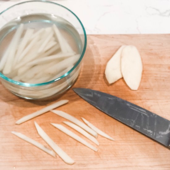 - Slice potatoes into skinny fries, and place into boiling water. Par-boil the fries, about 5 minutes (you should be able to stick a fork in a fry and it will have a little give). Remove from water and pat until completely dry with a towel.