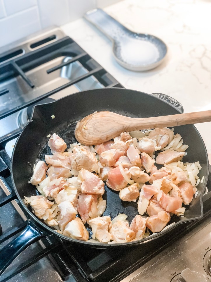 - In a large skillet or pan, sauté onions in two tablespoons of olive oil over medium heat. Once onions soften, increase the heat to medium high and add chicken to the pan.