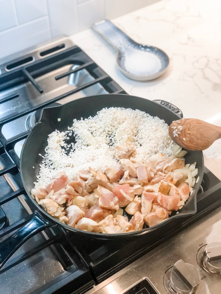- Push chicken to one side of the pan and add additional tablespoon of olive oil to other side. Add the uncooked rice in the olive oil and saute it for a couple of minutes.