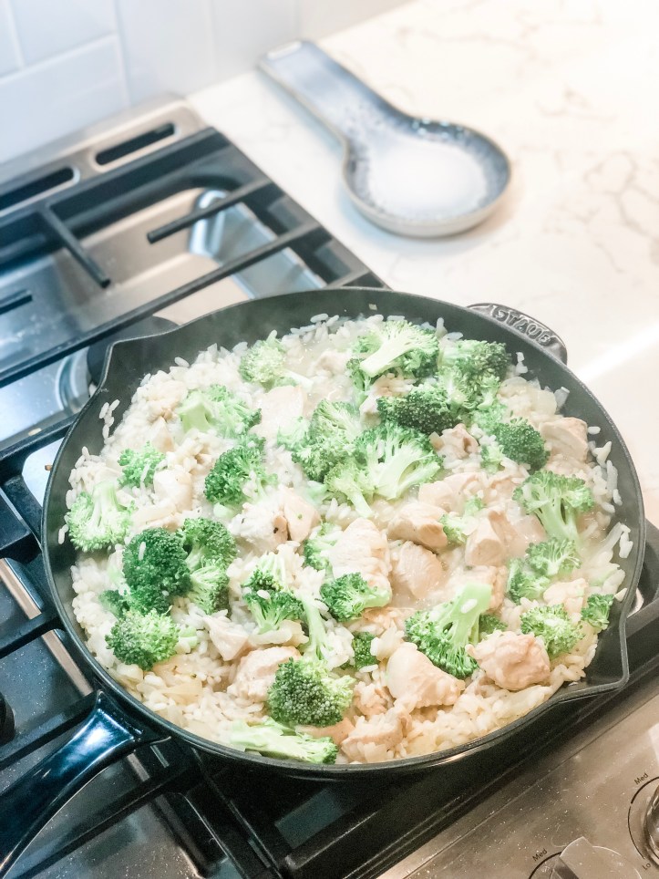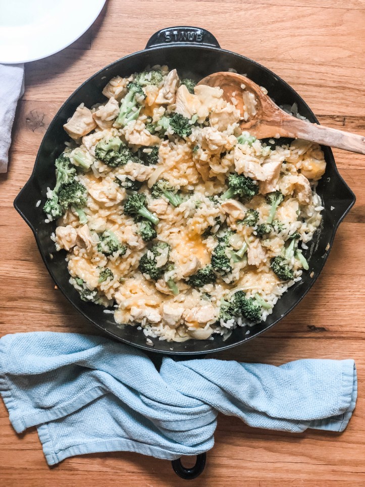 I’m such a super-fan of one-pan meals. They are easy to make and easy to clean-up. This one is great too because even the rice is cooked in the same pan. All you’re doing when you make it is layering upon layering flavors – first the onions, then the chicken and garlic, then the rice… it keeps on getting better from there with broth, broccoli and of course, cheese.