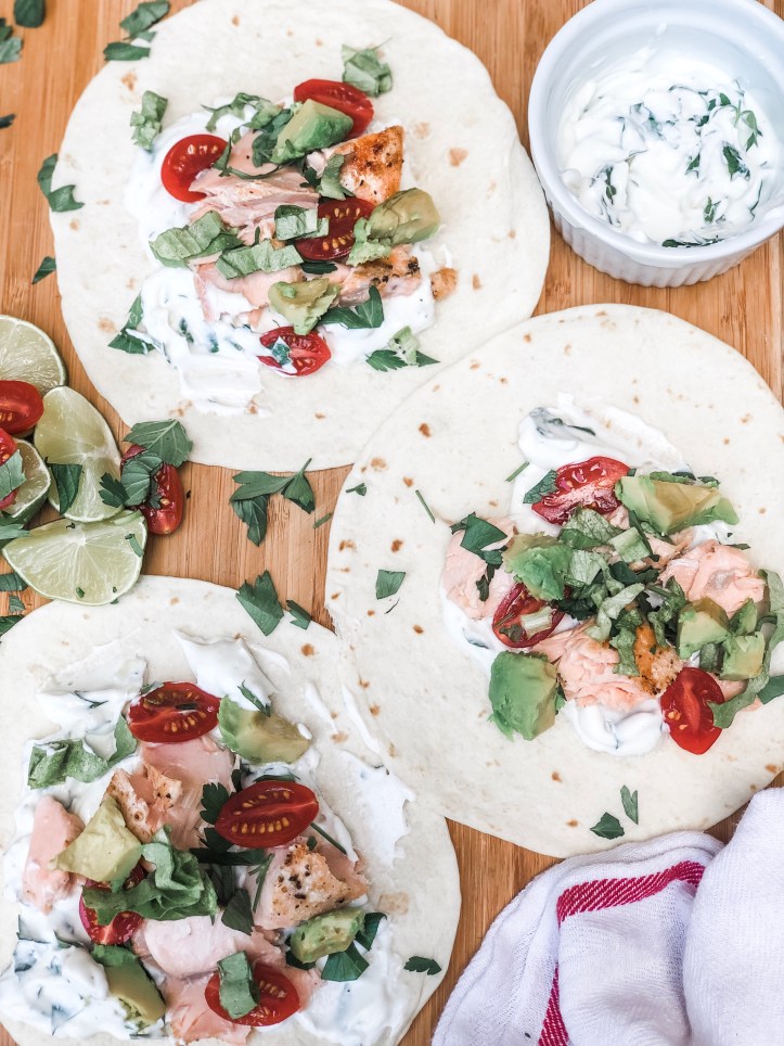 - To serve, warm the tortilla in the (already warmed) oven for a minute. Remove and layer with yogurt mixture, then salmon and top with avocado, lettuce and tomatoes. Serve with lime wedges and enjoy immediately!