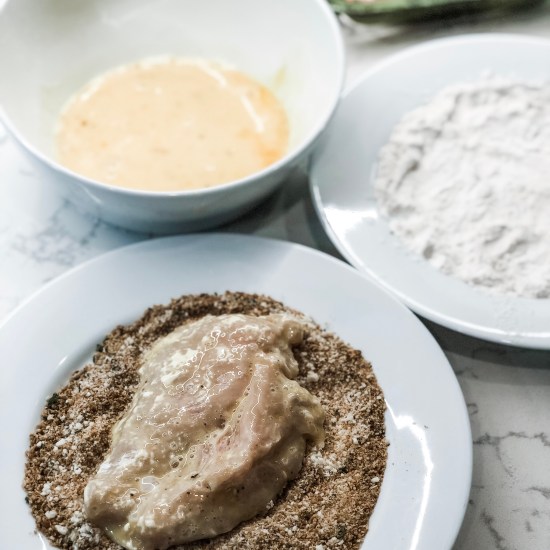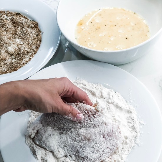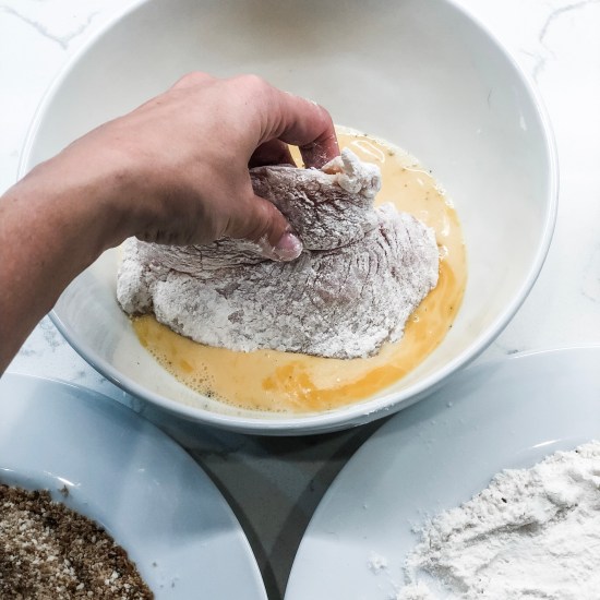 3. Coat chicken cutlets with seasoned flour. Dust off any extra flour. Dip chicken cutlets in egg mixture and coat. Then dip in the breadcrumbs and coat.