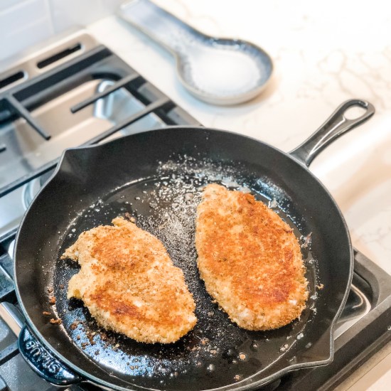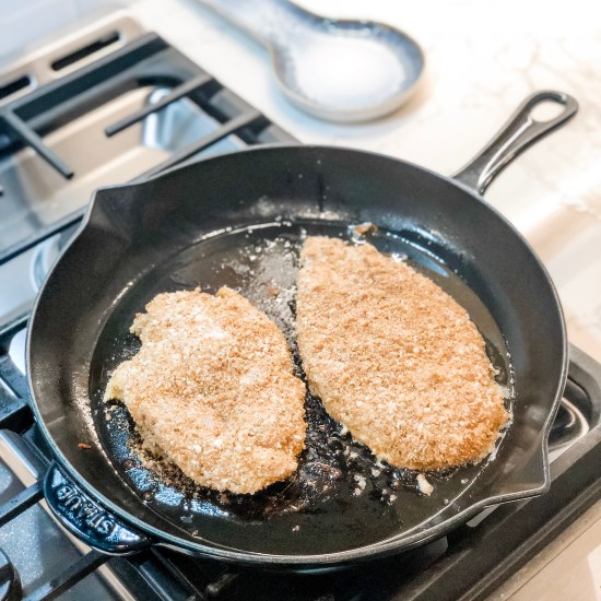 4. Add breaded chicken cutlets to the prepared skillet and fry for 4-5 minutes per side, depending on size (cook in batches, if needed).